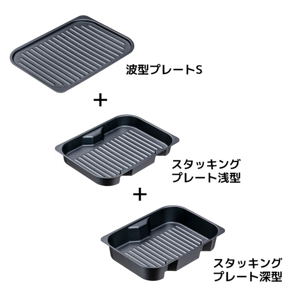 仕様 <サイズ> ●波型プレートS: (約)W180×D245×H7mm ※重量:(約)350g ●スタッキングプレート浅型: (約)W180×D245×H30mm ※重量:(約)450g ※容量:(約)1.1L ●スタッキングプレート深型: (約)W180×D245×H45mm ※重量:(約)510g ※容量:(約)1.6L <材質> 本体:スチール(板厚1.0mm) 表面加工(内面):シリコン樹脂塗装 表面加工(外面):焼付塗装 <対応熱源> 魚焼きグリル・IH100〜200V・オーブン・オーブントースター・ガス火 ※食洗機対応 ※電子レンジでは使用不可グリルを汚さず美味しく調理! スチール製のグリルプレート。